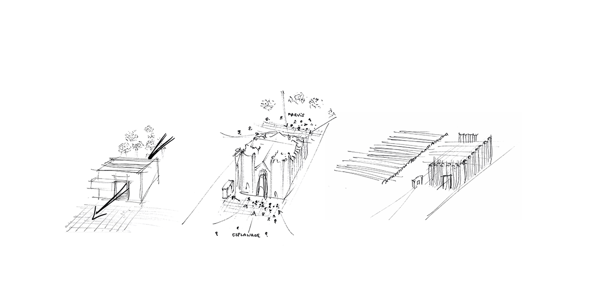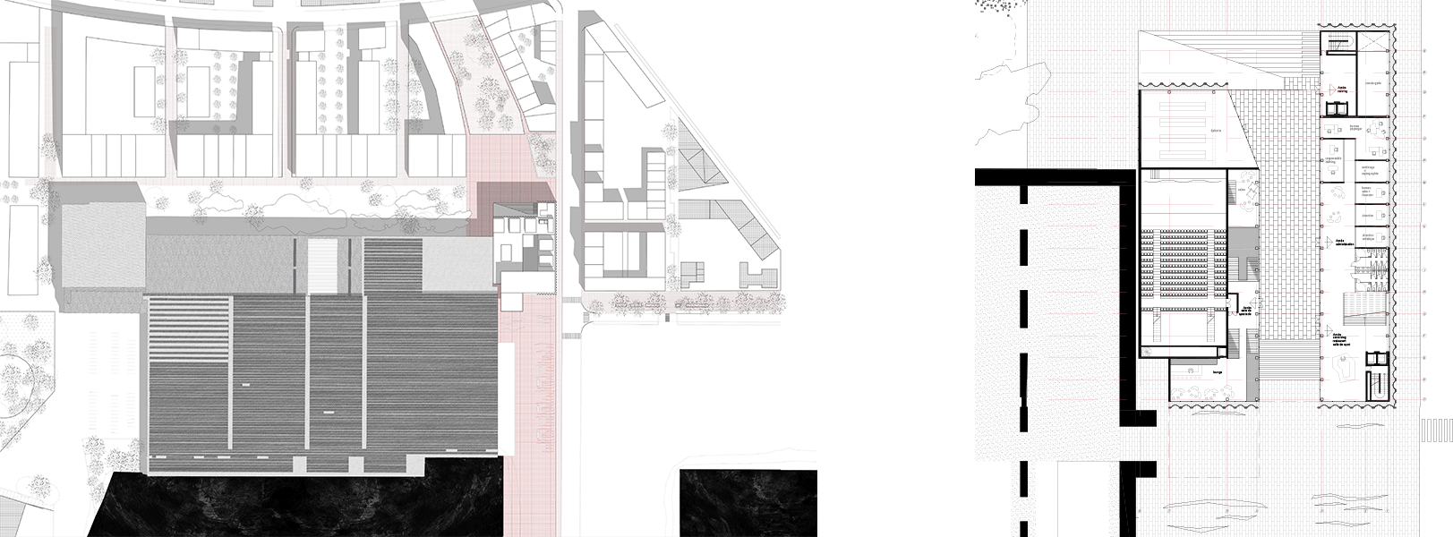 At the urban scale, the project will be a signal to enhance a new submarine base entry, clearer in the new organization of the quarter in link with the new maritime museum and the Citée du Vin. The implantation of this monolithic block requires a strong connection with the ground with a stable base, creating a transition between a park and the dock area. This new axis enables sculpting the monolith to design an urban hall, a new confluence space where everything is possible.