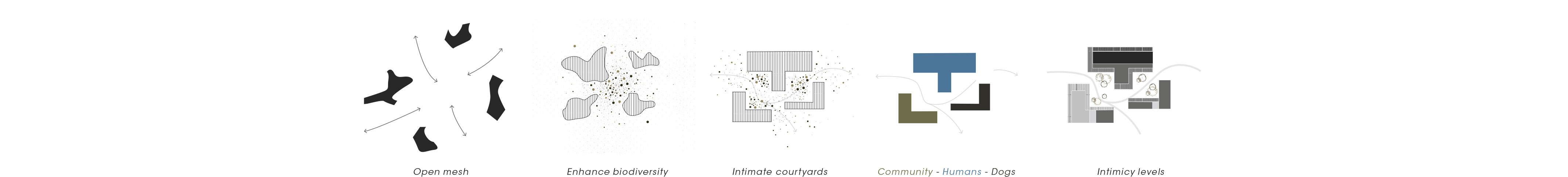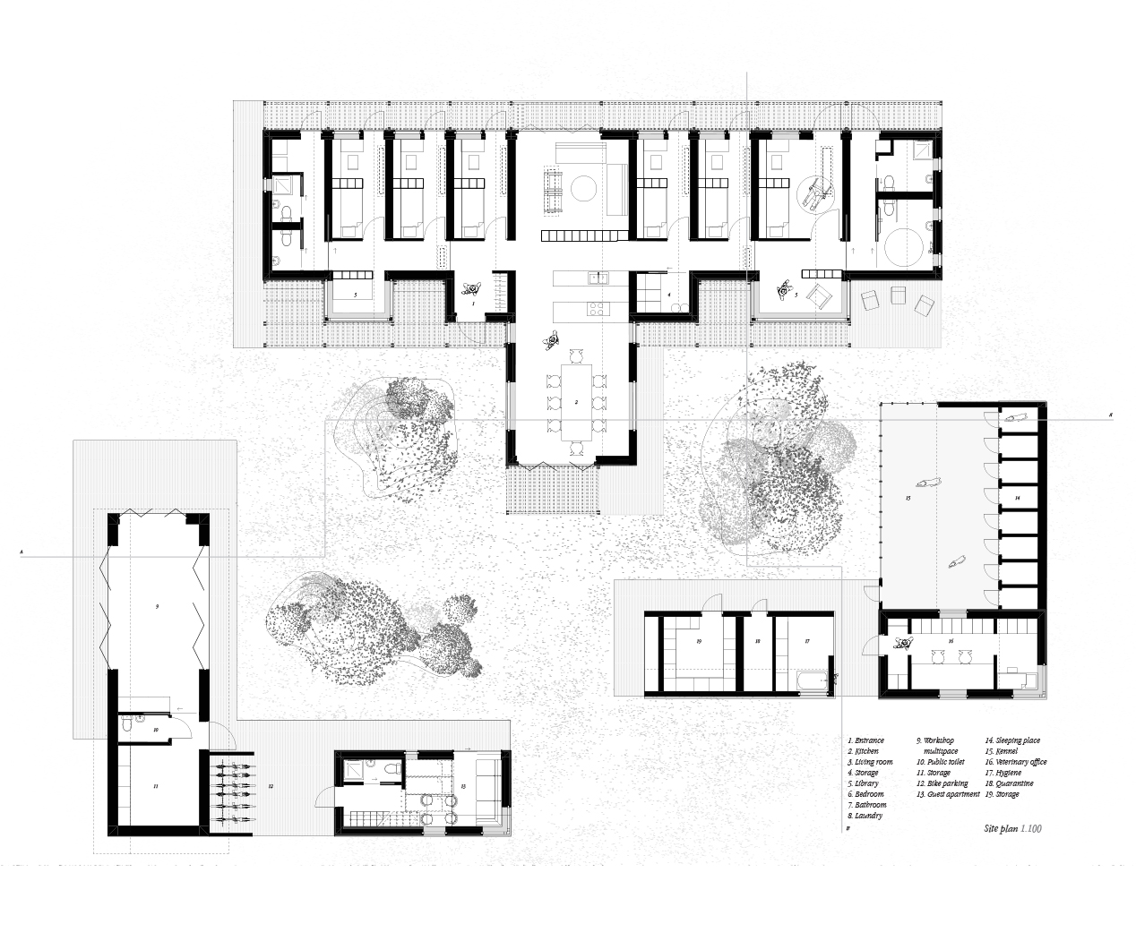 The first one is manifested through a journey of spaces with varying grade of privacy, ranging from the public space to the very private. In this both human and dog can find comfort upon arrival and evolve together over time. The common ground for the residents is the kitchen, situated in the heart of both the main building and amongst the surrounding buildings.