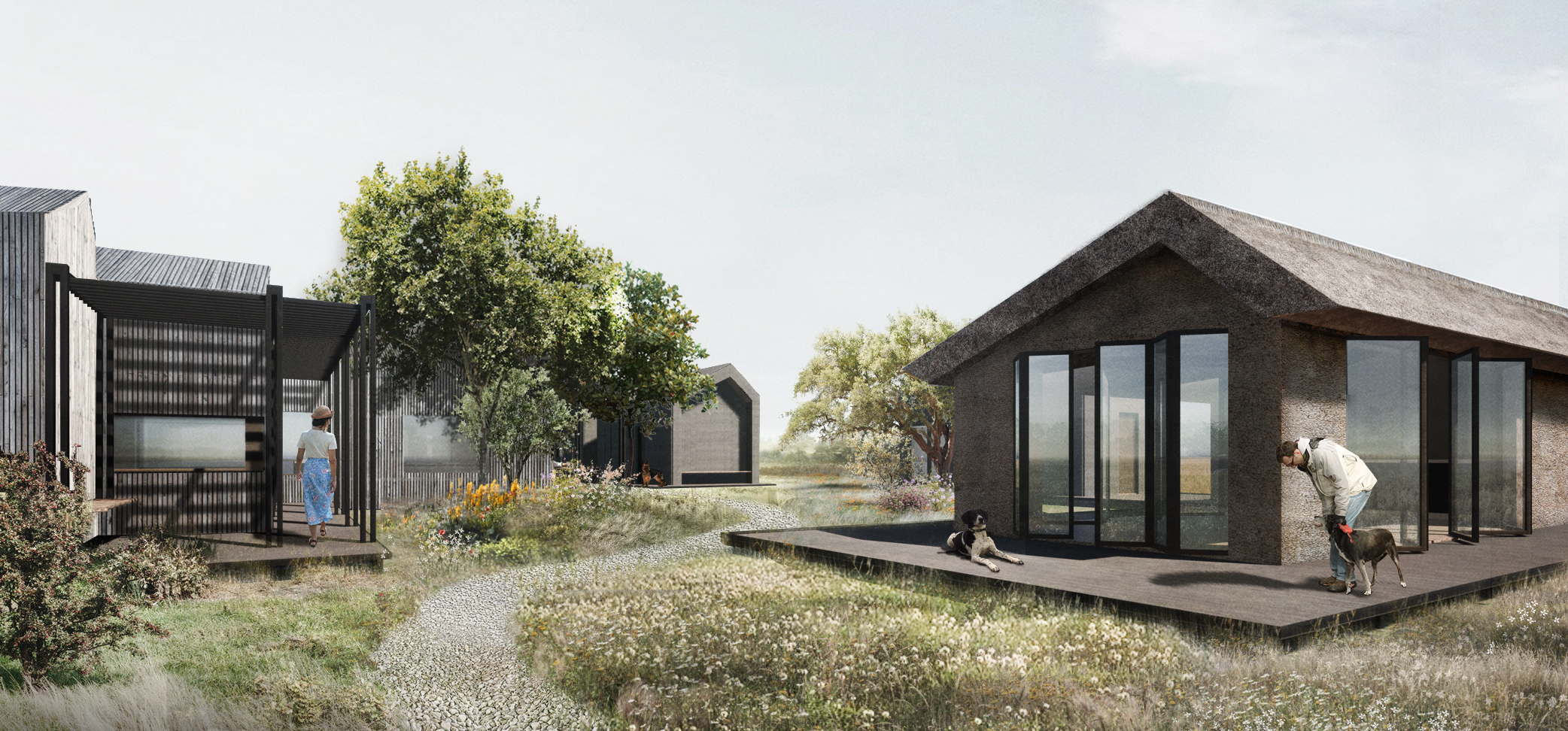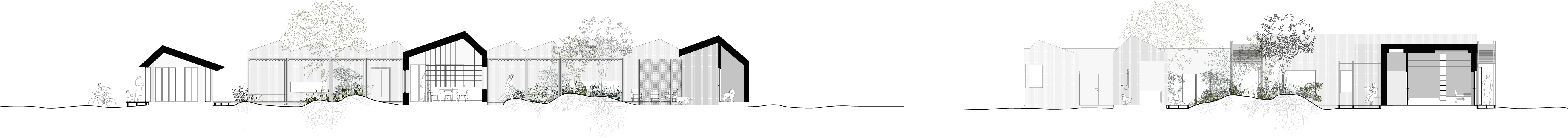 Spreading the program to smaller volumes creates a sense of place between the buildings. We imagine a loadbearing construction in CLT (cross-laminated timber), facilitating a good indoors climate and replicability, but we imagine local adjustments in cladding, using local knowledge and skills. Lighter construction can be made in cooperation with the residents, creating local adjustments and ownership.